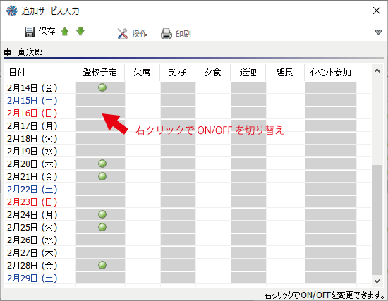 出席一覧で生徒を選択して、オプション申込みメニューから、追加サービス名をクリックで追加されます。 1ヶ月分をまとめて設定するには、月別一括設定をクリックします。(生徒一覧からも設定できます)