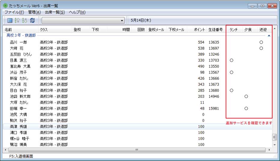 | ■ 学童保育などで追加サービス(ランチ、送迎など)の申し込みを管理できます。 出席一覧から追加サービスの申し込み状況を確認できます。 ※ 本機能はLite版では使用できません。
