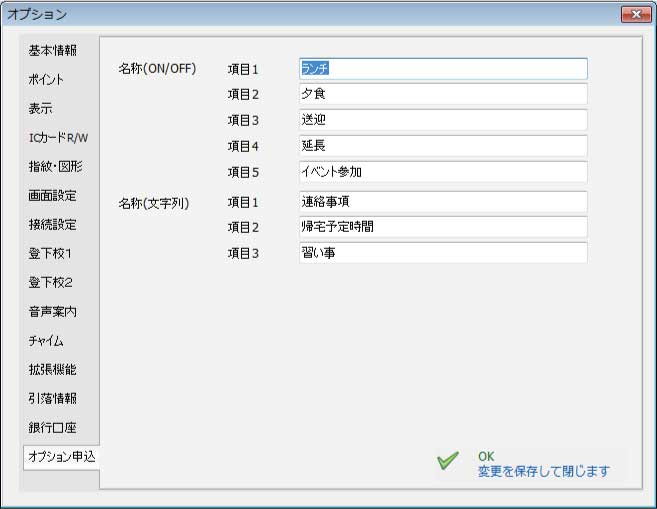 オプション、オプション申込みタブで追加サービスの名称を設定できます。 追加サービスは5項目設定できます。