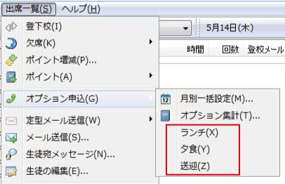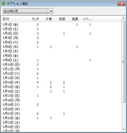出席一覧で生徒を選択して、オプション申込みメニューから、オプション集計をクリックすると日別の申し込み数が表示されます。