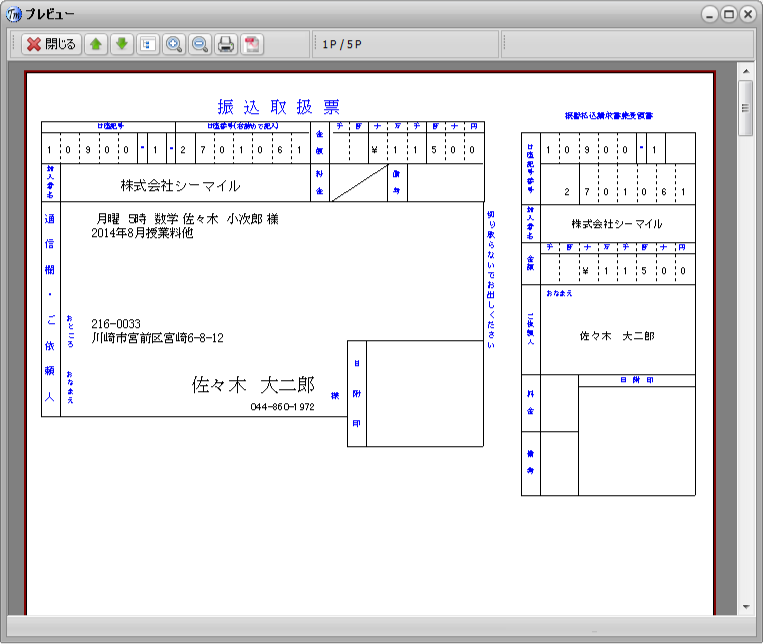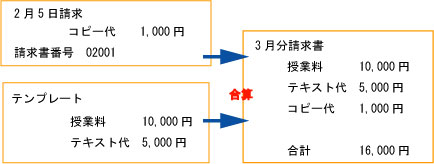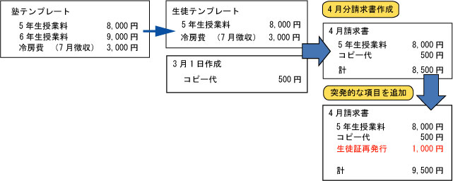 一括請求書作成時には、あらかじめ生徒ごとにテンプレートを作成しておくことにより、毎月発生する費用と4月、10月だけに発生する費用などを 登録することができます。 一括請求書作成した請求書に項目を追加することも可能です。 請求書作成機能は毎月発生する固定的な伝票(授業料など)を一括して作成します。(一括請求書作成) また、突発的な伝票(生徒証の再発行、入塾時の前納分の請求書など)も作成できます。 突発的な伝票は一括請求書作成時に含めることが可能です。もちらん一括作成時に含めないことも可能です。 一括請求書作成した請求書はCSVファイルに出力することができます。また、メールで送ることも可能です。 授業料管理とも連動しています。一括請求書作成で作成された請求書は授業料管理に未入金として計上されますので、入金と未入金が一目で 分かります。 銀行へ渡す引落用のファイルの作成も可能です。結果の取り込みも可能です。 郵便振替用紙の印刷も可能です。 請求書は生徒ごとに印刷できます。また、塾の控えとして、一覧表でも印刷ができます。 ![]() ![]() ![]() |