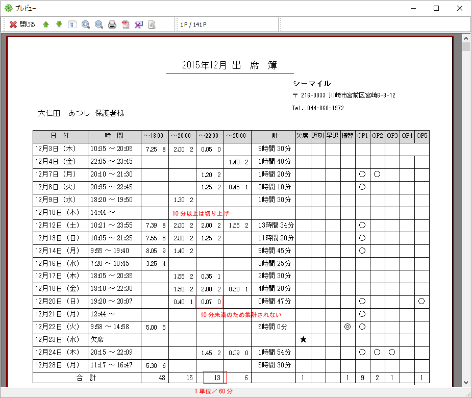 時間帯ごとの単位数(上記で設定した集計単位)やランチなどのオプションを一覧にした出席記録を印刷できます。