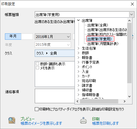 印刷時に帳票種類を出席簿(学童用)を選択してください。