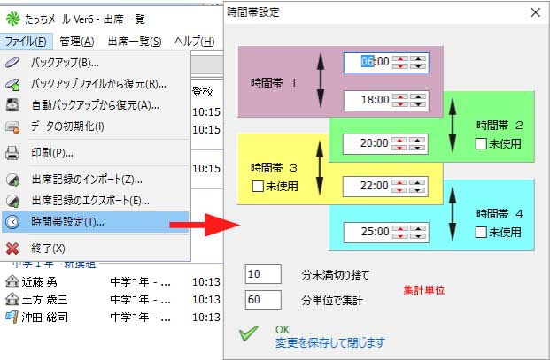 出席一覧を表示して、ファイル、時間帯設定をクリックします。