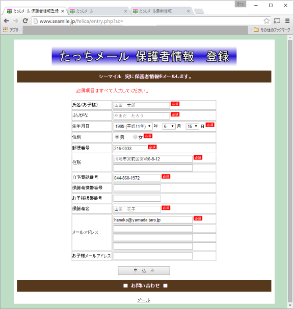 メールアドレス、住所、電話番号などを保護者にウェブから入力してもらいデータをメールで受け取ります。