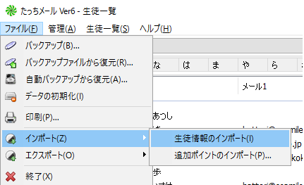たっちメールで生徒一覧を開き、ファイル、インポート、生徒情報で先ほど保存したファイルを読み込みます。