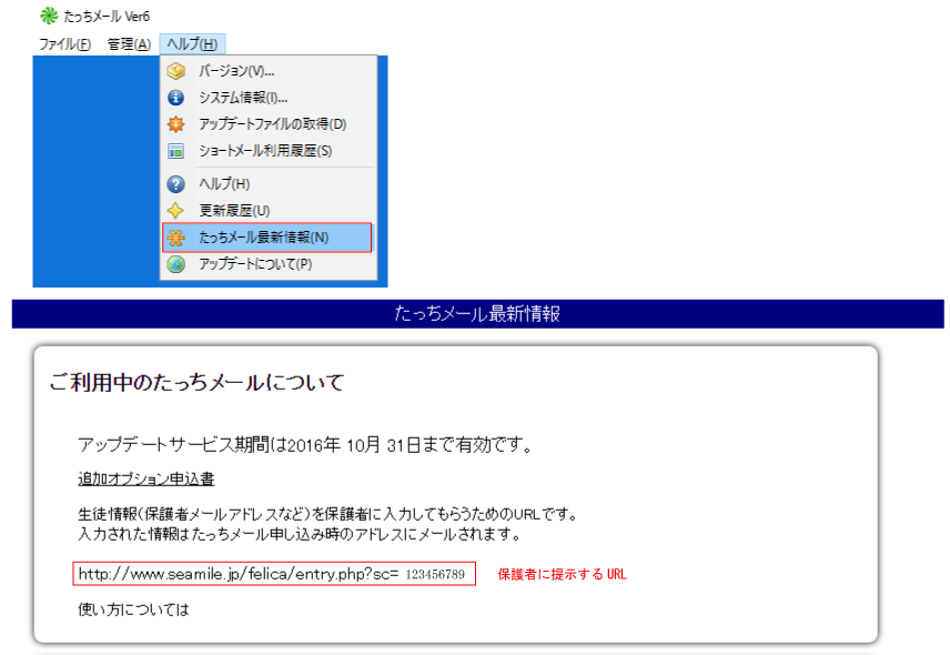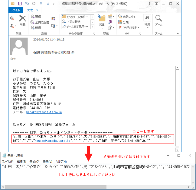 メールに記載された情報をファイルに保存し、たっちメールでインポートすることで生徒情報が取り込めます。