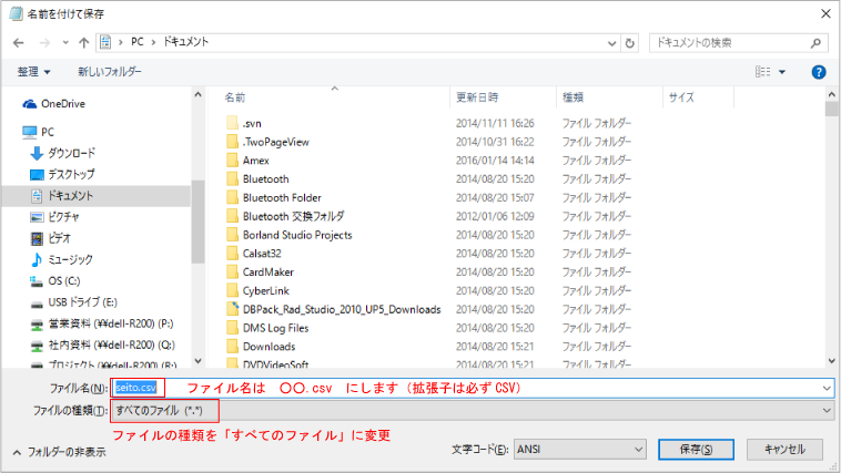 メモ帳を保存します。拡張子は必ずCSVにしてください。ファイルの種類を「すべてのファイル」に変更しないとTXTで保存されます。